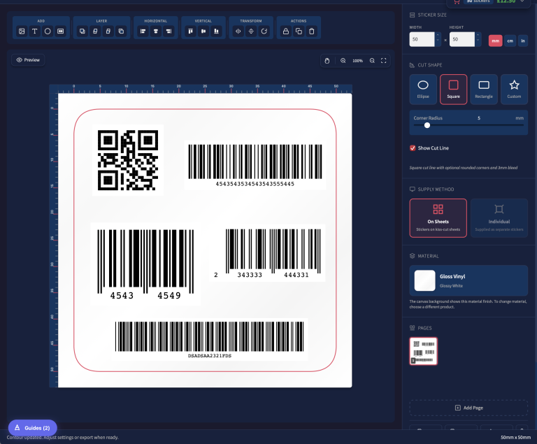 Simply select the type of code, select if you require them on all pages or not, then position it as required. Our sticker designer will then add all the codes to all your chosen pages.