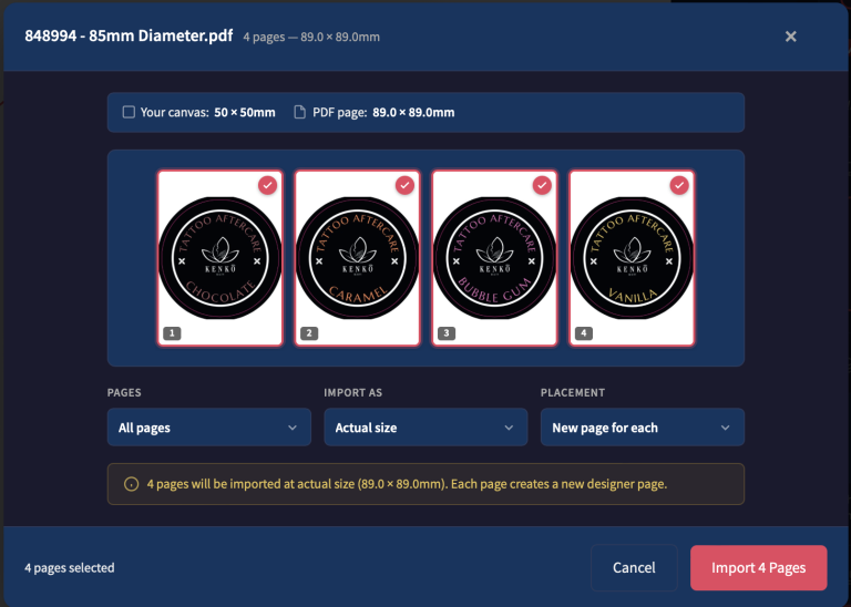 If you have many designs for an order, simply import the one multi-page PDF and we’ll place all the artworks into your designer template instantly, creating a page for each design.