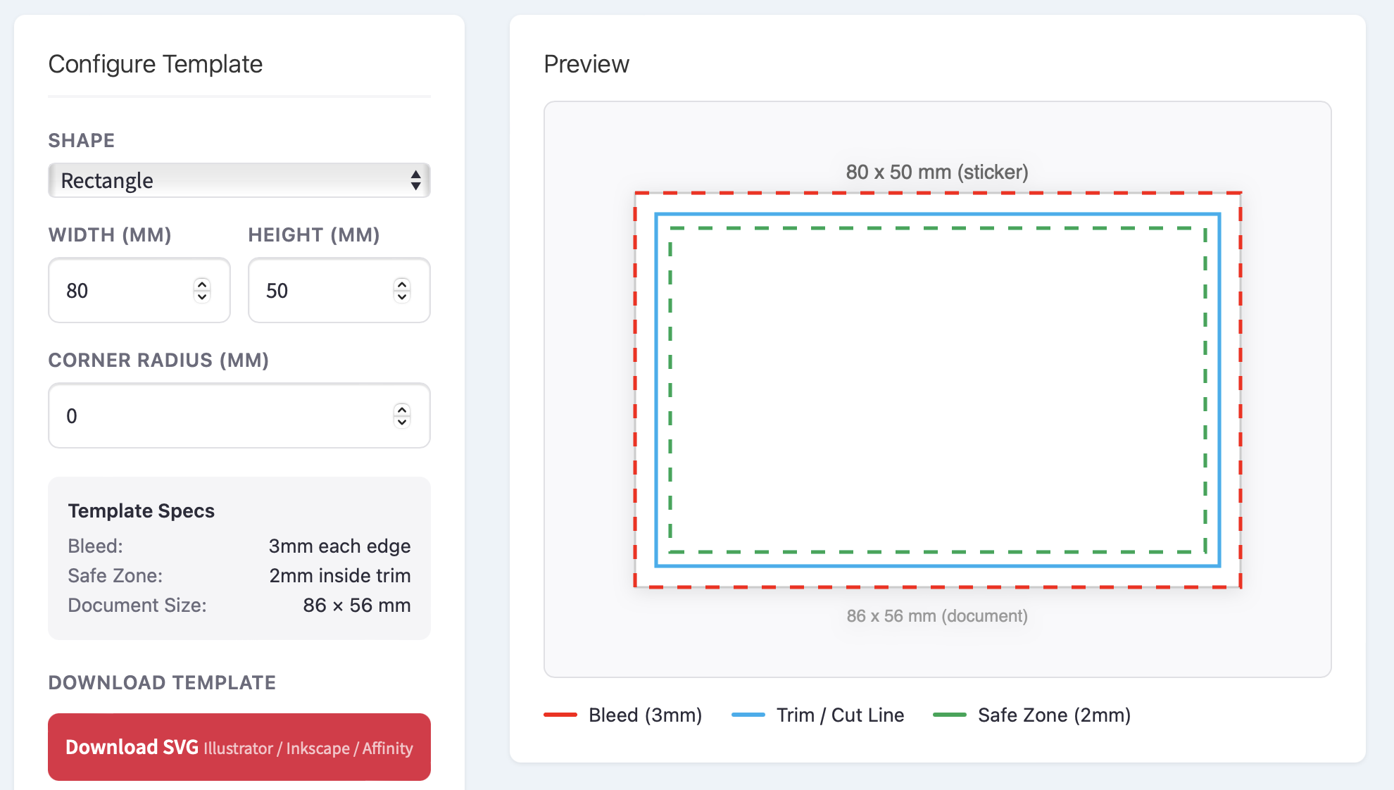 Our designer handles all three automatically. When you pick a shape and size, the cut line is generated instantly from the actual cutter path. Bleed is added to the outer edge without you doing anything. The safe zone is shown as a visible guide inside the canvas so you know where your design can go. You don’t have to think about any of it — and you can’t accidentally skip it. Every design that leaves our designer is print-ready by definition.